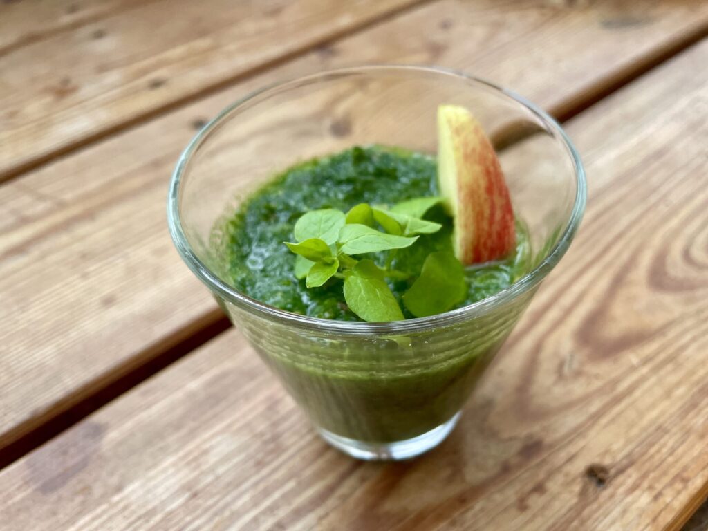 Dieser grüne Shot ist besonders gut in der Herbstzeit, wenn die Apfelernte stattfindet, denn frische Äpfel gesellen sich sehr gut zu den grünen Blättchen der Miere. Hierfür nehmt Ihr: