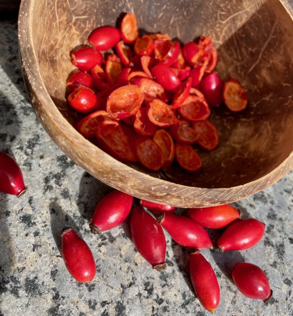 Ich bevor­zuge die einfachste Methode der Verar­bei­tung zu einem vitamin­rei­chen Tee. Hierzu nehme ich einfach die ganzen Früchte, denn ein Aufschneiden und Entfernen der Kerne ist mir zu aufwendig.